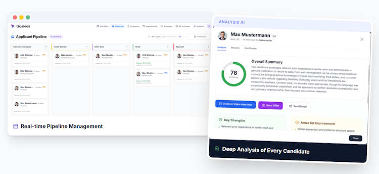 Goaleos operates as a standalone web based ecosystem accessible through user specific interfaces for both job seekers and employers. The platform runs continuously to process interviews and produce assessments without manual intervention. Its architecture supports automated candidate ranking, interview analysis, and applicant tracking functionalities that demonstrate comprehensive backend data processing capabilities. The AI functions as an analytical tool to inform human recruiters, with final hiring decisions remaining under human control. Candidates access the platform at no cost while employers subscribe to utilize its full recruiting features.