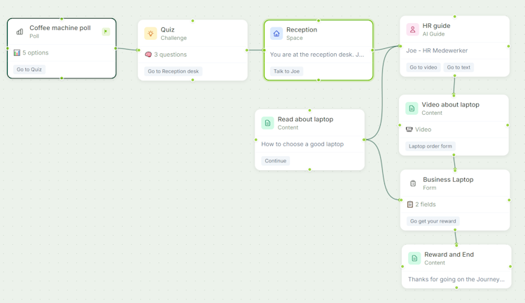 The platform offers seven modular building blocks that administrators can arrange using a drag and drop interface without coding. The space module uses interactive floor plans linked to panoramic images to enable virtual navigation of offices, warehouses or production facilities. The guide module deploys document grounded AI chatbots that respond exclusively from uploaded company documentation and include source citations for verification. The content module supports integrated text, images and video embedding for direct instruction. The challenge module delivers multiple choice quizzes with automated scoring and configurable passing thresholds. The form module facilitates secure collection of digital signatures, file uploads and feedback. The poll module captures real time sentiment and feedback from participants. The reward module generates and distributes digital certificates upon completion. The platform supports branching logic to create conditional pathways based on employee roles, department assignments or assessment results. All content can be localized into fourteen languages through a single click.