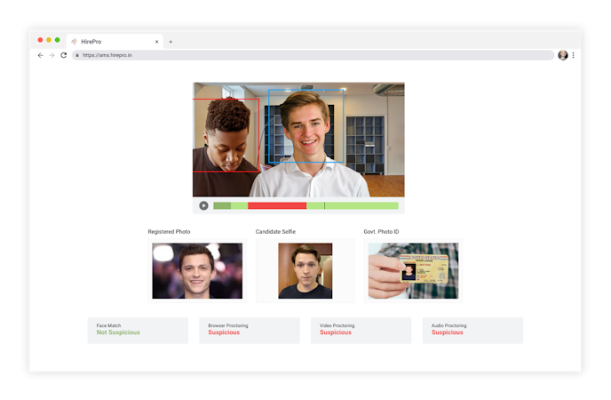 HirePro’s AI-powered identity verification to authenticate the identity of the interviewee. Our verification tool validates the identity of the candidate by checking it against their registration photo, driving license, passport, tax card, voter’s card, or national identity card .A complete video recording is archived for future reviews and audits.
