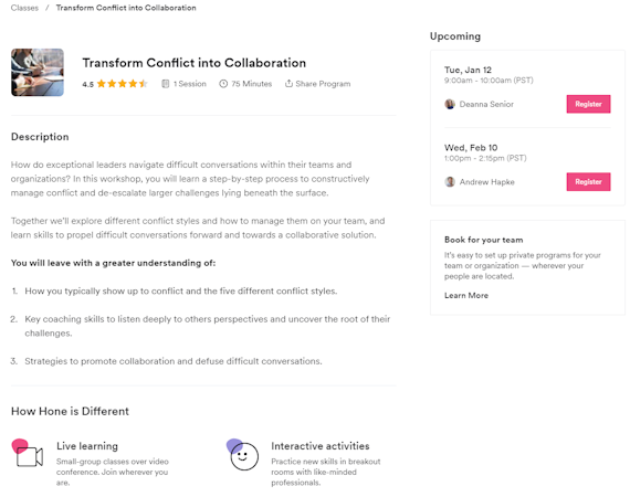 World-Class Coaches: Our unique and measurable live classes are hosted by the world's best instructors, not internal facilitators. This is a unique feature for Hone and why our content drives real behavior change.