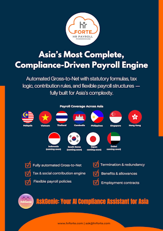 HR Forte is an all-in-one HR and payroll platform designed specifically for businesses operating across Asia. It delivers automated, country-compliant payroll with built-in tax calculations, social insurance handling, and labor-law alignment for markets such as Vietnam, Malaysia, Singapore, Thailand, Cambodia, the Philippines, and Hong Kong.