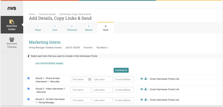interview builder allows businesses to design interview guides based on role requisitions, helping employers analyze candidate skills and improve the overall selection process. It lets hiring managers select industry-specific question sets for guides and sort them using advanced tagging capabilities. Teams can store documents in a centralized database and create customizable guides for individual stakeholders. Plus, users can arrange questionnaires based on preferred interview formats and edit guides before sending them to recipients, streamlining review processes.