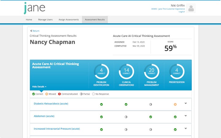 Jane is an artificial intelligence-enabled assessment platform designed to help medical facilities manage learning processes for healthcare staff members, identify competency gaps and improve care outcomes. Administrators can gain insights into nurses' test scores, assessment summary, and correct, missed, partial, and contraindicated answers