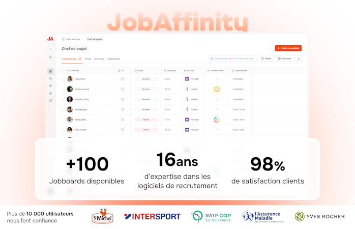 Fondé en 2009 par Intuition Software, JobAffinity est un Applicant Tracking System (ATS) français destiné à digitaliser et optimiser le processus de recrutement. Conçu pour répondre aux besoins des PME, ETI, cabinets de recrutement et collectivités locales, JobAffinity s’adresse aux organisations cherchant à gérer efficacement un volume important de candidatures tout en respectant les standards légaux et sécuritaires.