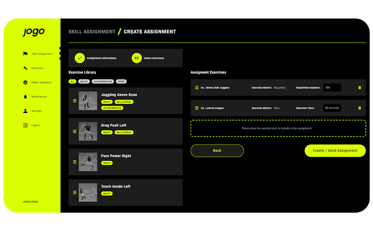 JOGO has a database of training and development videos for trainers to assign players. The application can be used to record exercises and send various details to coaches. Exercises are registered with AI technology, providing trainers with insight into player statistics. Individual training results of players are compared with benchmarks based on age, playing positions, teams, and other players. Using a player's collected data, the app can automatically suggest areas needing improvement.