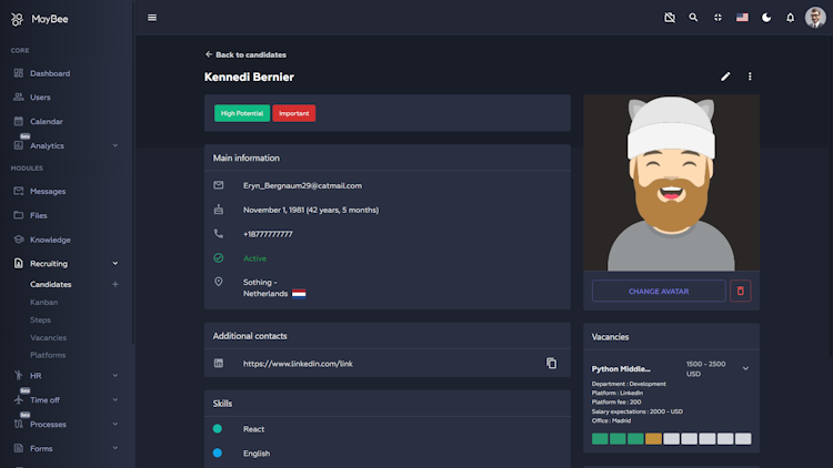 MayBee is an innovative and comprehensive human resources management system (HRMS) that combines all the necessary tools for successful workforce management. Designed to address the challenges faced by modern HR professionals and recruiters, MayBee offers a centralized platform to streamline and optimize a wide range of HR processes.