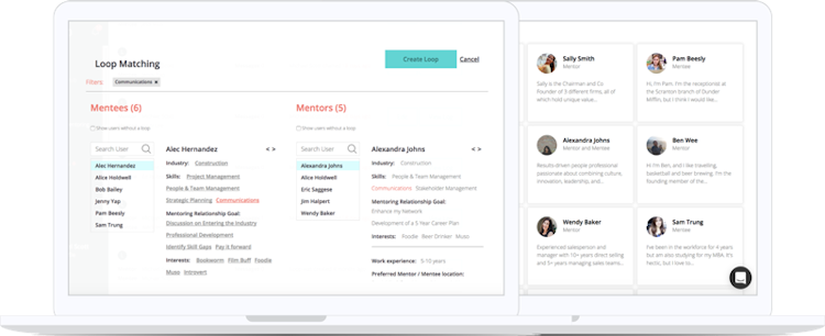 Mentors and mentees can sign up to the mentoring program online, through sign-up forms with customized survey questions. Form data is automatically piped into Mentorloop for matching of mentors and mentees. The built-in smart matching tools automatically match users based on selected criteria, including locations, interests, experience, skills, and desired outcomes. The optional My Match feature also allows mentors and mentees to select their own matches from the internal CRM of user profiles.