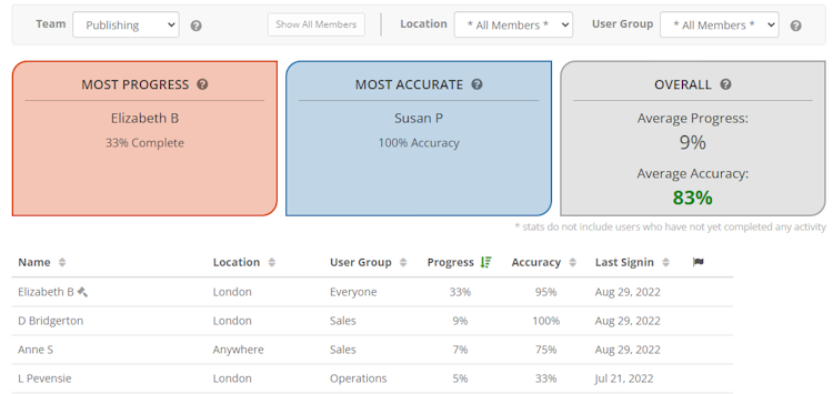 - Track progress on vital knowledge by content, user, or team.