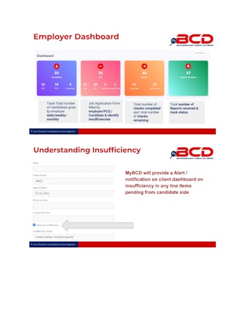myBCD is an automatic verification solution that provides real-time tracking and instant verification for white-collar and blue-collar. Key features include instant checks with direct cart and checkout options, SLA-driven automated background verification reports, and geo-tracking-based address verification.