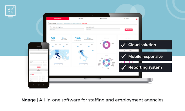 Ngage is a staffing agency software all-in-one by Arca24: ATS based on AI CV Matching cross-language capable of identifying the matching between profiles and job ads in 6 different languages, even if CV and offer are written in different languages + CRM, a complete customer relationship lifecycle management solution + powerful Reporting System. It reduces time for recruiting, manages all customer data, keeps track of the feedback received and simplifies the administration of candidates hired.