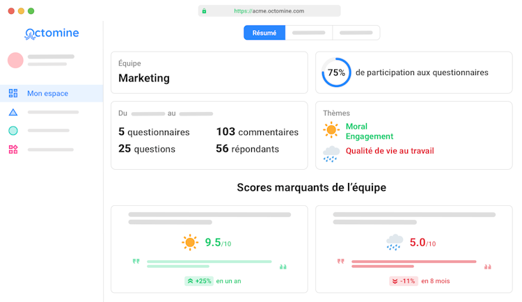 Thanks to Octomine, managers and HR teams better understand the challenges facing their teams and identify the priority actions to implement on the ground. With its simple, confidential, and customizable questionnaires, Octomine can survey employees on HR issues specific to each company (engagement, Quality of Life at Work, managerial relations, employer brand, etc.).