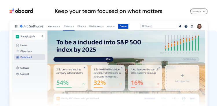 Oboard creates OKR solutions for Fortune 500 companies and fast-growing startups. Our OKR Board is the most installed OKR Jira add-on on Atlassian marketplace!