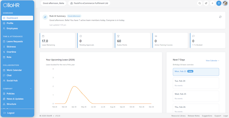 OlloHR is a cloud based human resources management platform designed for small and medium sized enterprises in the United Kingdom. The platform consolidates employee data management, leave administration, document storage, performance tracking and time management into a unified dashboard. It simplifies HR operations for organizations with both office based and deskless workforces across multiple industries. The system architecture is hosted in secure data centres and leverages encryption to protect sensitive information.