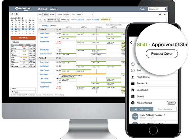 Orbital Shift is a staff management platform that helps businesses of all sizes reimagine their workforce and save on direct labor cost. Managers can create employee schedules in minutes with the help of customizable templates and color-coded event cards. The mobile time clock automatically records and time stamps employee hours for accurate time cards and payroll.