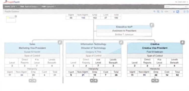 Managers can view employees and work organized by department or team using color-coding and sorting functionalities. Users can gain real-time insights into employees' details about payroll, benefits, performance, and other topics.