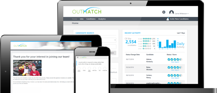 OutMatch is a recruitment solution designed to assist hiring managers with the hiring of talented people to the right job. By generating workforce analytics driven from a system of candidate assessments, the singular, cloud-based platform delivers the key insights predicting employee performance and guiding talent strategy. With OutMatch Assessment, hiring managers can engage candidates with a custom branded experience optimized for convenient completion on mobile platforms, choosing from hundreds of suggested job profiles to target the results. A resulting "Match Score" measures best fit, while a "Match Report" reveals key traits such as personality, numerical reasoning, logical reasoning etc. Interview guides then provide a structured format to suggested or customize questions with the facility to record answers into the system, gleaning deeper responses on cultural or organizational fit, competency and unique behavioral characteristics.