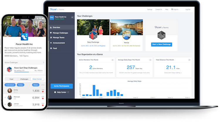Participants use the Pacer Pedometer & Fitness app to access their step challenge and track their physical activity on all devices. Challenge administrators set up and manage the challenge through an intuitive, web-based portal on the Pacer website.