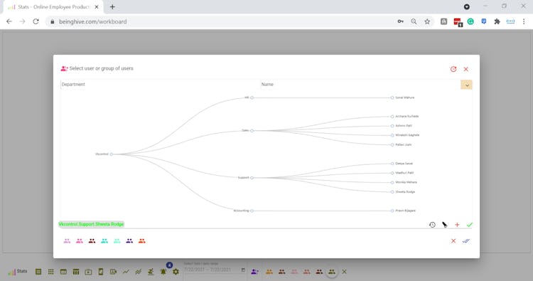 Live status of all employees on a single card, showing who is absent, away, on productive, on non-productive, neutral & uncategorized app or URL