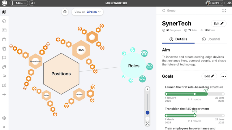 First, users can build an interactive map of their people, teams, roles, and work allocation to gain a clear understanding of the current state. Next, they can invite peers to discover one another and track real-time changes on the collective organizational chart. Finally, users can integrate goals, projects, and employee data as additional layers to complete the big-picture view of the organization.