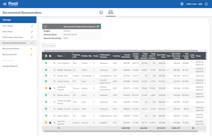 Pivot Remuneration is a cloud-based remuneration management solution which enables businesses to manage employee compensation, including salaries, incentives and bonuses. Flexible budget management and customizable business rules allow users to ensure alignment with company policies, and managers are guided to policy adherence with a built-in traffic light system. Long-term and short-term incentive (LTI & STI) plans can be managed, and Pivot Pay also supports lump sum payments to employees in lieu of salary increases. Employee records, reports, and letters including remuneration statements can all be created automatically.