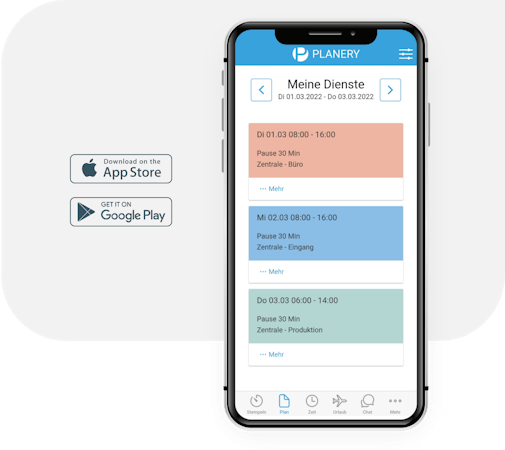 The managers can supervise these time stamps whereby Planery automatically checks the working time and gives feedback on any transgression. As a result, all legal regulations are complied with and the working hours are always available for payroll accounting.