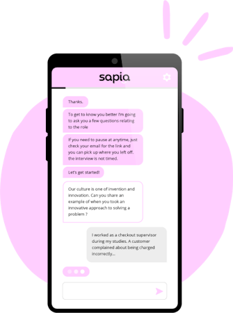 Through a smart online chat, Sapia’s Smart Interviewer Phai finds your perfect matches and progresses them directly to a video interview for your hiring team to review. Just two stages, and you’ve found the right talent for the job.