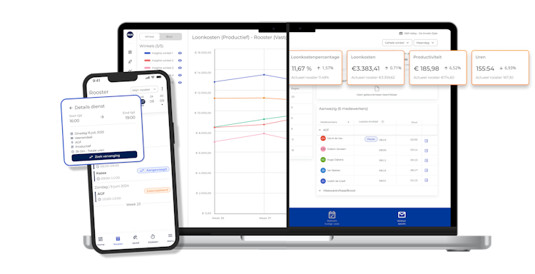 The platform centralizes all key workforce processes, including demand-based scheduling, real-time labor monitoring, attendance tracking, cost analysis, and productivity insights. Managers and planners can view planned versus actual performance throughout the week, helping them adjust staffing levels quickly. Employees use the mobile app for schedules, shift changes, availability, and leave requests.