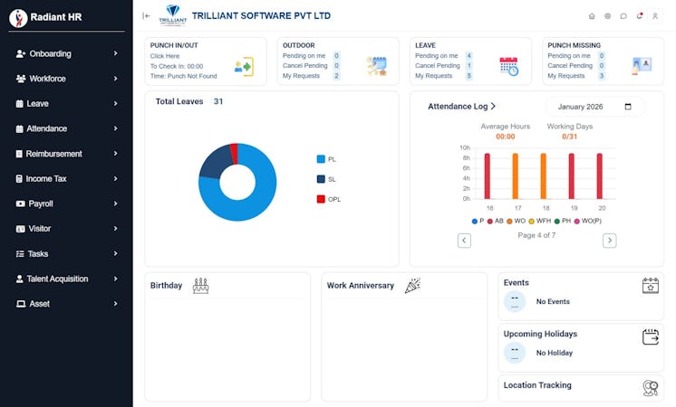 RadiantHR is a comprehensive Human Resource Management System developed by Trilliant Software that automates and streamlines HR operations across organizations of all sizes. This solution combines automation capabilities with an intuitive user interface to address complex challenges faced by modern HR departments. RadiantHR caters to organizations with remote workforces, regulatory obligations and a need to digitize manual HR processes. The platform is designed to scale with organizational growth while preserving operational efficiency in multiple HR domains.