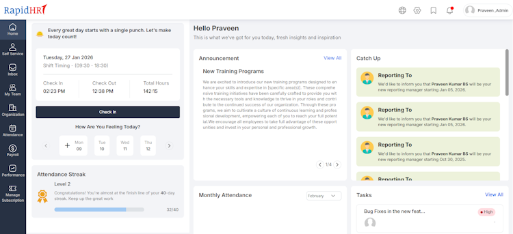RapidHR is an AI enabled human resource management system and payroll software platform designed to automate and streamline HR processes across organisations. The platform serves as an all in one solution for core HR management, performance management, workflow automation, attendance tracking, payroll processing, leave administration, task coordination, onboarding and recruitment. Organisations seeking to digitise HR operations and optimise operational costs use this comprehensive system to manage human capital efficiently. The software supports businesses that require scalable employee database management, automated workflows and compliance driven payroll administration across multiple locations.