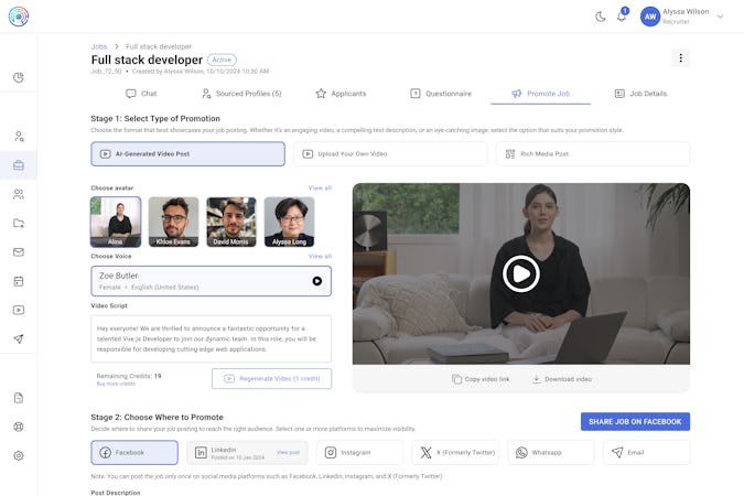 • Automated Job Promotion & Video Campaigns: Promote job openings across multiple boards and social channels. Generate AI-powered video promotions to boost visibility and attract quality talent.