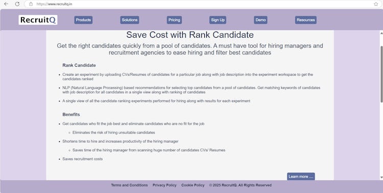RecruitQ is a sophisticated candidate filtering system designed for hiring managers and recruitment agencies seeking to streamline their selection process. The platform employs Natural Language Processing technology to analyze and rank candidates from a pool of applicants, providing a systematic approach to identifying the most suitable individuals for specific positions. The system operates through an experiment workspace where hiring professionals can upload candidate resumes alongside job descriptions, after which the software processes the information to generate comprehensive rankings based on keyword matching and relevance.