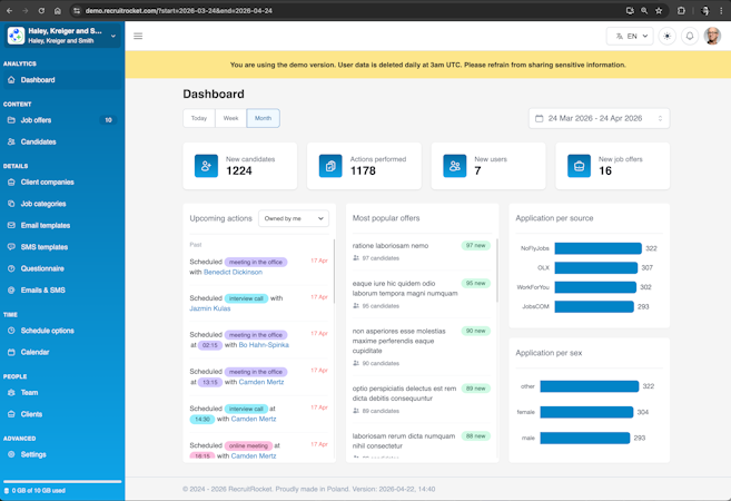 The platform provides extensive functionality for managing recruitment workflows with customizable job offer templates that enable organizations to create branded visually consistent postings aligned with corporate identity standards. RecruitRocket includes a common candidate database with advanced skill tagging and searchable profiles that facilitate filtering and identification of qualified candidates based on specific competencies and language proficiencies. Integrated communication tools encompass single click calling functionality through Twilio integration, email template management for personalized candidate communications and SMS template functionality with direct messaging capabilities for candidate outreach. A meeting calendar module supports interview scheduling and action planning while a dashboard delivers daily reminders for planned activities such as calls and interviews. Team collaboration is supported through internal commenting features on candidate profiles and client collaboration capabilities permit external stakeholders to access shared job offers and candidate information, observe recruitment progress and contribute feedback. Separate company profiles consolidate all job offers in one location, eliminating the need to manage postings across multiple external career portals.