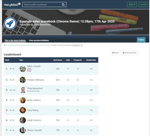 Sales leaderboard publishing for individual managers to engage execs in their score. Display on a mobile-friendly web leaderboard, big screen TV or share as an image on internal social media (e.g. slack). Send a personalized score dashboard to each team member each week via email.