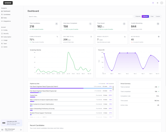 The dashboard provides metrics on time to fill, completion rate, retention rate, and screening volume over customizable time periods to support data driven decision making. User controls include configurable scoring thresholds, custom interview question sets, and role based access permissions that maintain human oversight over final hiring decisions. Detailed analytics and reporting features offer insights into screening processes, candidate evaluations, and hiring intelligence patterns. The platform streamlines first round interviews and delivers continuous learning to align early hiring signals with on the job success.