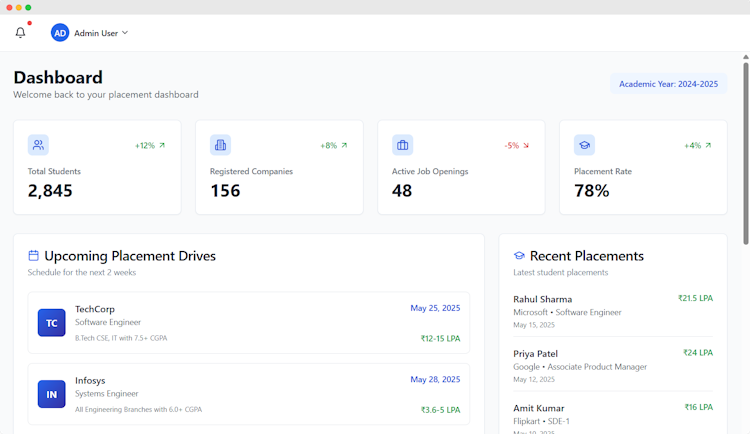 The platform facilitates deeper industry-academia collaboration by maintaining a centralized employer database with engagement tracking capabilities. Institutions can collect valuable feedback and execute automated email campaigns to nurture employer relationships. This multi-dimensional approach extends beyond traditional placements to encompass research and development partnerships, sponsorships, and skill development initiatives. The system delivers actionable data insights through one-click placement reports, year-over-year trend analysis, departmental dashboards, and detailed role and salary information, allowing institutions to align academic goals with industry expectations.