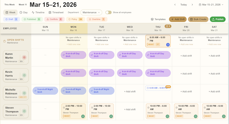 ShiftArmor delivers comprehensive time and attendance functionality including employee self service clock in and clock out, shared kiosk mode, live attendance status monitoring, timesheet review workflows and payroll export tied directly to published schedules. The employee management module maintains centralized profiles with certification tracking, compliance badges and bulk CSV import capabilities to verify worker qualifications at a glance. The training matrix offers a program library, session scheduling tools, enrollment tracking and automatic renewal alerts across eight industry specific templates to enforce credential requirements. Leave and paid time off management encompasses request submission, manager approval workflows, real time balance tracking, automated accrual policies, blackout date enforcement and family medical leave act eligibility monitoring within the same scheduling environment.