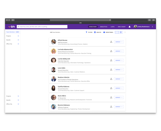 Sift is a social search engine designed to help sales, business operations, IT, professional services and internal communications teams discover colleagues and connections in the enterprise network. The employee directory software enables executives to discover employee information including team breakdowns, skills, and interests, create groups for colleagues with similar attribute sets, and filter out candidates for cross-functional projects.