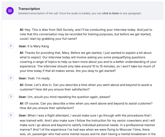 Alex's seamless AI-driven conversations feel truly human, enabling organizations to interview talent at scale anytime, anywhere. The platform's next-level pre-qualification capabilities allow users to tailor questions and criteria to match specific roles, ensuring only the most qualified candidates move forward. The AI-powered interviews are customized for a natural, human-like experience, eliminating scheduling hassles and enabling smarter real-time hiring. Skill Society's comprehensive candidate insights provide tailored assessments and simplified team collaboration through easy-to-share reports and recordings.