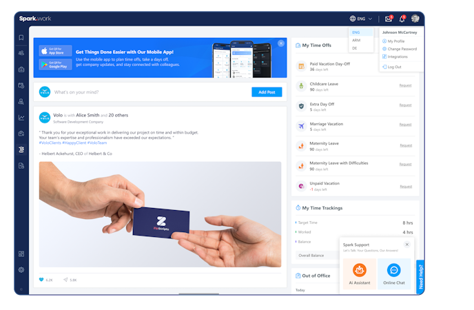 Whether you’re scaling a startup or managing a global enterprise, Spark.work adapts to your needs with modular features, API integrations, and white-label options.