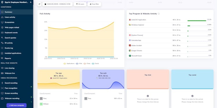 Spyrix Employee Monitoring is a surveillance solution designed to help businesses track, record and analyze employee activities on company computers. The system operates from the cloud and is accessible from any location and device. It provides detailed insights into productivity patterns and potential security threats across corporate, educational and remote work environments. The solution caters to organizations that require comprehensive oversight of resource usage and protection against data leakage.