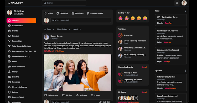 Tallect is a comprehensive total rewards management platform designed to unify and streamline compensation, benefits and employee engagement programs for organizations seeking to optimize people cost investments. The solution serves as an all-in-one system for human resources departments, compensation teams and organizational leaders who manage complex reward structures across global workforces. Tallect caters to enterprises requiring sophisticated tools to achieve pay transparency, equity and strategic alignment between market benchmarks and total rewards strategies while eliminating the need for multiple disconnected systems.