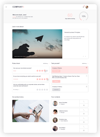 With our world-class software you can create personalized journeys for your new hires, where they can view content relating to the company and their role, complete onboarding assessments, view progress, communicate with colleagues, access roadmaps, fill in online forms, and more. Our mobile-friendly, cloud-based platform is designed to be accessed on-the-go, facilitating a seamless, personalized experience for your newest colleagues.