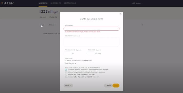 Assessment platform with simulation labs and custom quizzes