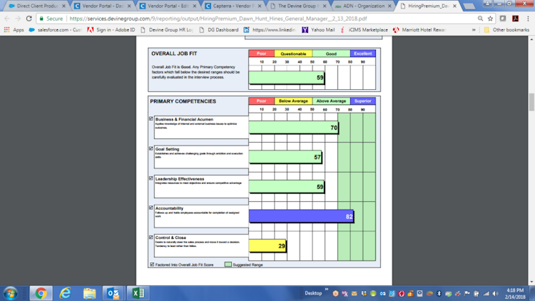 In order to help businesses make informed hiring decisions, The Devine Group offers a range of tools for assessing and analyzing talent, and can be used for all types of job positions from entry level to management roles. Pre-employment assessments can be used to assess candidates and filter those with specific skill sets and other prerequisites. Users can utilize the job model builder to define job competency models, and the TalentMatch tool allows recruiters to compare a specific candidate's assessment results with more than 80 job profiles in order to find the best fit for each role.