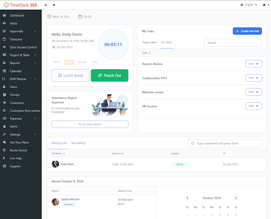 Using Timeclock 365, employees can punch in and punch out from anywhere via the mobile application, and request time-offs and leaves according to requirements. Managers can view where employees are working, how many hours they have worked, manage their time-off requests, work on reports, and calculate payrolls.