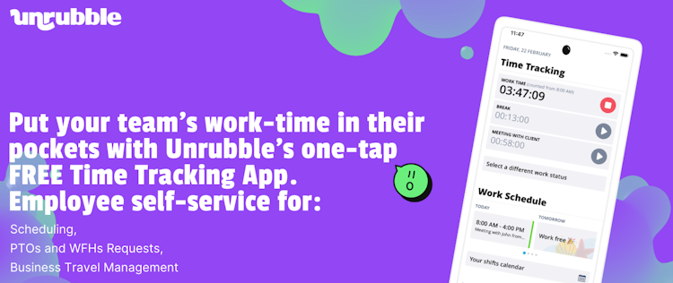 Unrubble is the ultimate work time management tool with over 300K users. Simplify time tracking, scheduling, PTO & business travel requests, and streamline your work time management process.