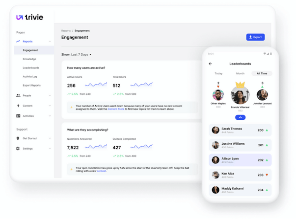 Trivie’s intuitive gameplay functionality gives employees a familiar context in which to learn, offering trivia and game challenges with multiple choice, true-false, pictures, videos and more. Engagement calendars and push notifications allow users to automate the training scheduling process, which can be inserted into any learning curriculum. The content importing tool allows users to transfer training material into a game, in a snap.