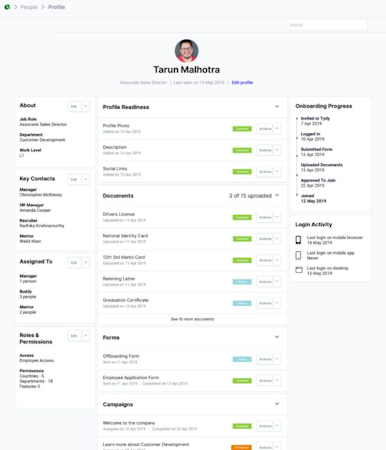 Tydy's consolidates and unifies employee data across every single app and system to create automated employee journeys, intelligent insights, and a completely personalized experience. People managers can gain visibility into interactions, events, activities, patterns, and trends, receive and send notifications, get alerts on engagement and drop-off rates - all on a centralized dashboard.