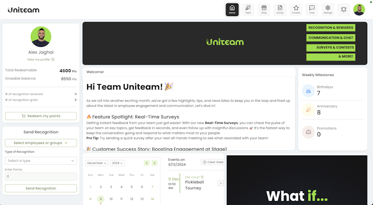 The Uniteam platform offers a range of features to build a thriving workplace culture. Employees can be recognized and rewarded for their achievements, from milestone celebrations to instant recognition. The flexible points-based rewards system allows companies to offer customizable rewards that employees will truly appreciate, such as donations, swag, or even unique experiences like a trip or lunch with the CEO. To keep teams connected and informed, Uniteam streamlines internal communications through instant messaging, announcements, and collaborative spaces. Customizable contests can be used to fuel business growth and drive key initiatives, motivating the team to excel while rewarding them for hitting milestones and reaching goals. Additionally, the platform provides robust employee survey capabilities, empowering companies to gain valuable insights, measure satisfaction, and make data-driven decisions to improve the workplace.