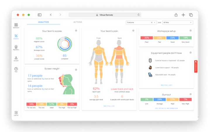 The analytics take into account the workspace setups of teams compared to the industry average, they can track team pain and view analytics based on different tags such as office, home, or other different locations.